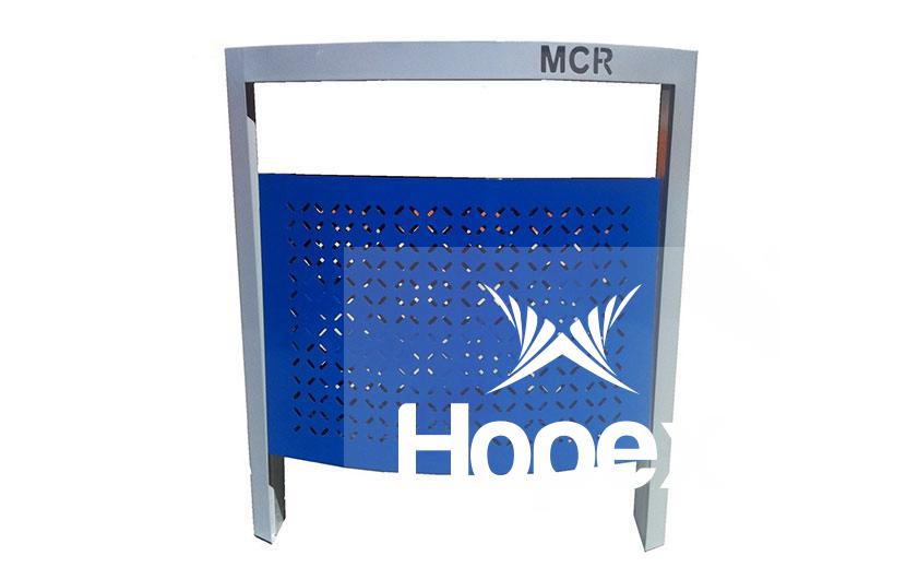 Construido de chapa laminada, con punzonado artístico en sus caras anterior, posterior y sobre la base, en su interior un soporte para la fijación de la bolsa. Montado sobre un arco de fijación de estructura tubular laminada con pivotes de ambos lados para bascular.